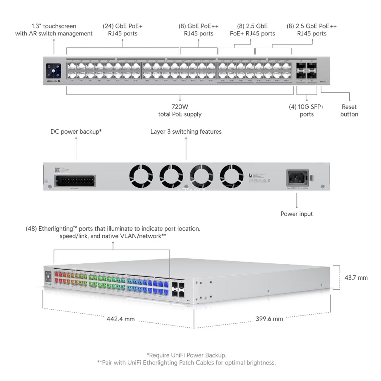 Funkcja podświetlania portów Etherlighting pozwala na identyfikację lokalizacji portu, prędkości per łącze oraz natywnej sieci VLAN per sieć. USW-Pro-Max-48-PoE może pracować w trybie ciągłym, nawet w przypadku awarii prądu, z uwagi na obsługę zasilania awaryjnego DC.