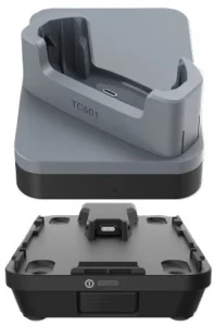 Akcesorium umożliwia jednoczesne ładowanie urządzenia oraz komunikację przewodową Ethernet, dzięki czemu terminal może synchronizować dane lub być zarządzany w sieci firmowej podczas ładowania.